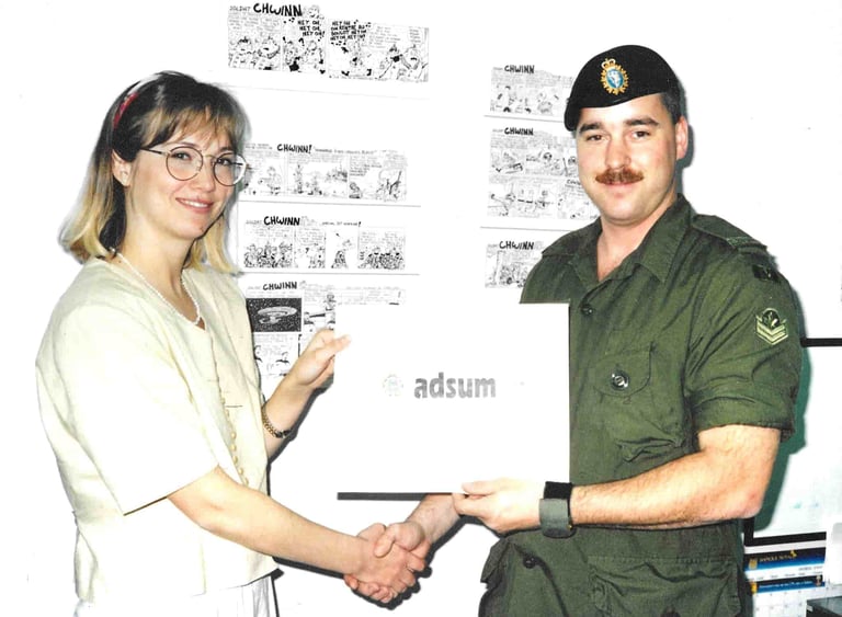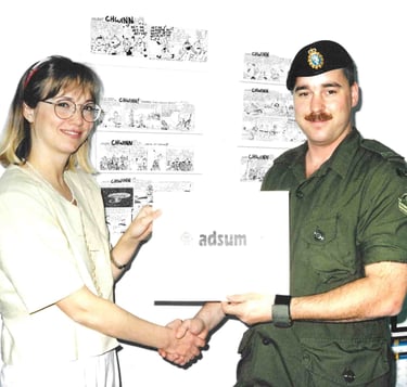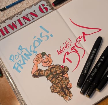 C’est au cœur de la vie militaire que Denis Bisson a donné naissance au SOLDAT CHWINN, un personnage haut en couleur à la fois attachant, maladroit et profondément humain. À travers ses aventures humoristiques, il met en lumière les réalités du quotidien militaire avec une touche d’autodérision, offrant ainsi un regard à la fois lucide et bienveillant sur la vie en uniforme.